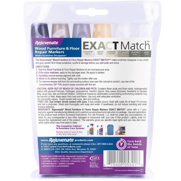 This 6-piece marker set is the easiest way to get your white & gray furniture and flooring restoration project off to a great start. Use the Exact Match Rejuvenate Wood Furniture & Floor Repair Marker Set to eliminate scratches, scuffs, and other damage. It’s the perfect product to prepare your wood floors, furniture, kitchen cabinets, and bathroom cabinets for cleaning and restoration. The 6-piece repair marker set includes; Melamine White, Bright White, Antique White, Light Gray, Medium Gray, and Dark Gray colors to mix and match any light-colored wood tone. Perfect for residential and commercial use.